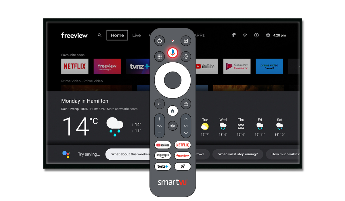 Press the mic button on your SV12HD Remote and tell Android TV™ what you want. Try "Jurassic Park", "Comedies set in London" or "What's the weather like in Hamilton?".